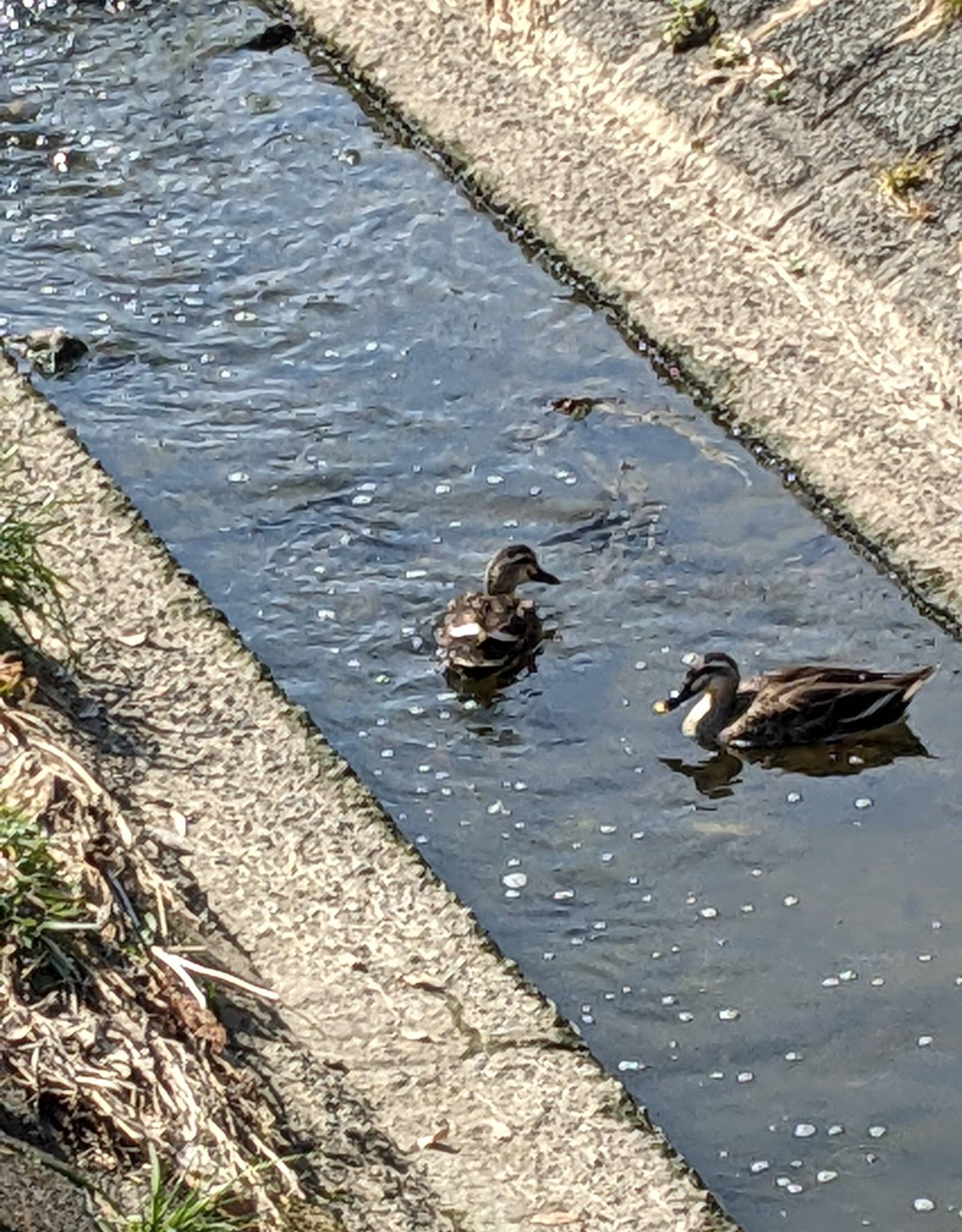 カモの夫婦が小さな川で泳いでいたり。